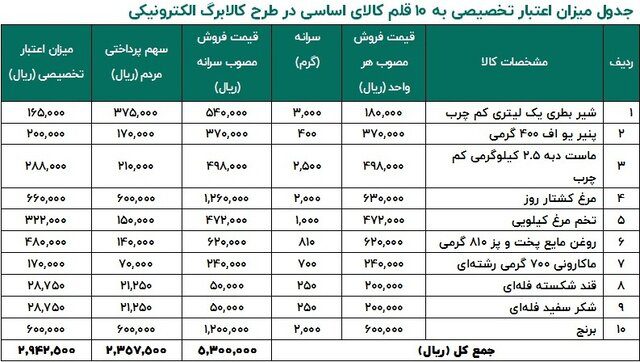 وی با اشاره به لیست اقلام مشمول طرح درباره ارزش ریالی سبد، گفت: سبد ۱۰ قلمی شامل ماست، شیر،‌ پنیر، قند و شکر، ماکارونی، روغن مایع، برنج، مرغ و تخم مرغ ۵۳۰ هزار تومان ارزش دارد که اگر این مبلغ به دلایلی از جمله تورم احتمالی به ۵۵۰ هزار تومان افزایش یابد، سهم مردم همان ۲۳۵ هزار و ۷۵۰ تومانی است که در جدول ثابت باقی می ماند.