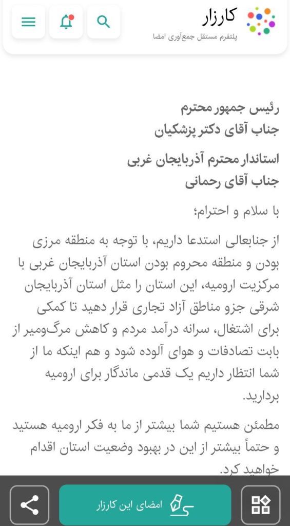 این درخواست در حال جمع آوری امضا از طریق پلتفرم کارزار می باشد و از آنجایی که این استان با سه کشور ترکیه، عراق و آذربایجان مرز مشترک و قابلیت خاصی در توسعه فعالیت های تجاری و صنعتی دارد درخواست تصویب منطقه آزاد برای کل استان آذربایجان غربی با مرکزیت ارومیه در بهبود وضعیت استان اقدام مهم تلقی می شود.