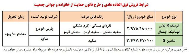 گروه خودروسازی سایپا قصد دارد از ساعت ۱۴ روز سهشنبه هفته جاری (۴ بهمن ماه) طرح فروش فوقالعاده دو محصول شاهین و کوییک R پلاس اتوماتیک را در برای دو گروه متقاضیان عادی و مادران برگزار کند.
