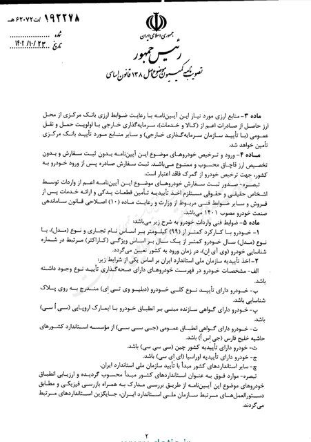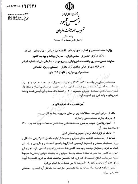 هیات وزیران در جلسه ۱۰ دی ماه ۱۴۰۲  به پیشنهاد وزارت صنعت، معدن و تجارت و به استناد اصل یکصد و سی و هشتم قانون اساسی جمهوری اسلامی ایران و ماده (۴) قانون ساماندهی صنعت خودرو مصوب ١۴٠٠ و اصلاحات بعدی آن، آیین‌نامه واردات خودروهای نو را به شرح زیر تصویب کرد: