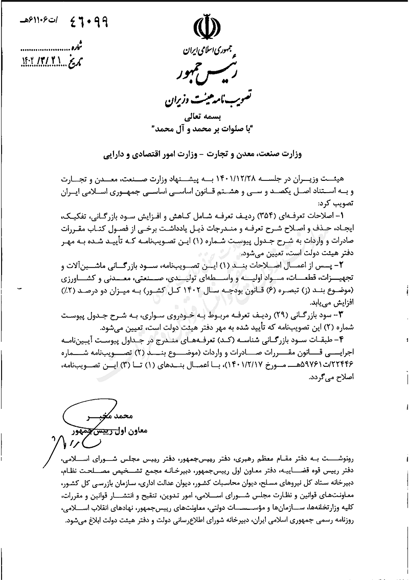 به گزارش کیان آنلاین، هیات وزیران ۲۱ خرداد ماه امسال مصوبه‌ای را تحت عنوان تغییر و اصلاح ردیف تعرفه ۳۵۴ قلم کالا را ابلاغ کرد. بر اساس این تصویب نامه که به امضاء معاون اول رئیس جمهور رسیده است، سود بازرگانی ۲۹ ردیف تعرفه‌ مربوط به خودروی سواری اصلاح و اعلام شد که به شرح زیر است.