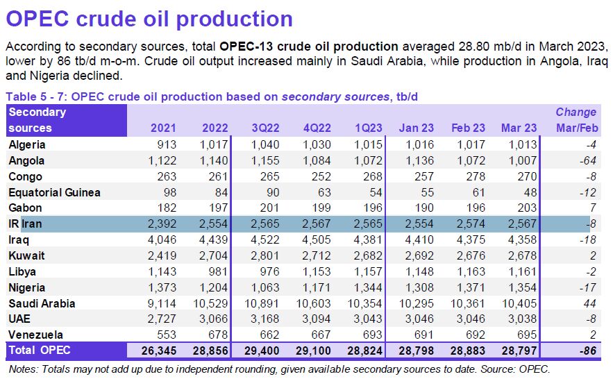 بر اساس گزارش منابع ثانویه، ایران در ماه مارس ۲ میلیون و ۵۶۷ هزار بشکه نفت خام تولید کرده که ۸ هزار بشکه کمتر از ماه فوریه ۲۰۲۳ (بهمن – اسفند) بوده است.