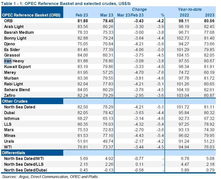 قیمت سبد نفتی اوپک هم در ماه مارس ۲۰۲۳ به ۷۸ دلار و ۴۵ سنت برای هر بشکه رسید که ۳ دلار و ۴۳ سنت کمتر از ماه فوریه ۲۰۲۳ است.