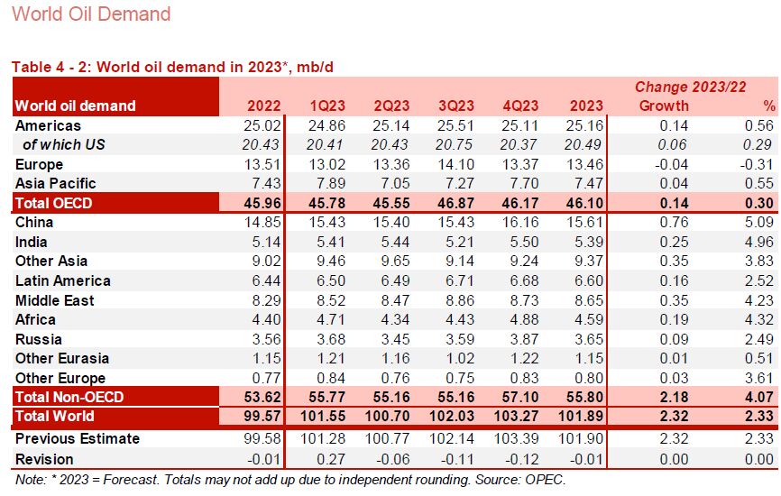 بر اساس تازه‌ترین گزارش ماهانه دبیرخانه اوپک (آوریل)، تقاضای جهانی نفت خام برای سال ۲۰۲۳ میلادی بدون تغییر چندانی نسبت به برآورد پیشین (گزارش ماه مارس) با ۲ میلیون و ۳۰۰ هزار بشکه افزایش روزانه همراه خواهد بود. مجموع تقاضای نفت جهان برای سال ۲۰۲۳ میلادی ۱۰۱ میلیون و ۸۹۰ هزار بشکه پیش‌بینی شده است، در حالی که در برآورد ماه گذشته این رقم ۱۰۱ میلیون و ۹۰۰ هزار بشکه اعلام شده بود.