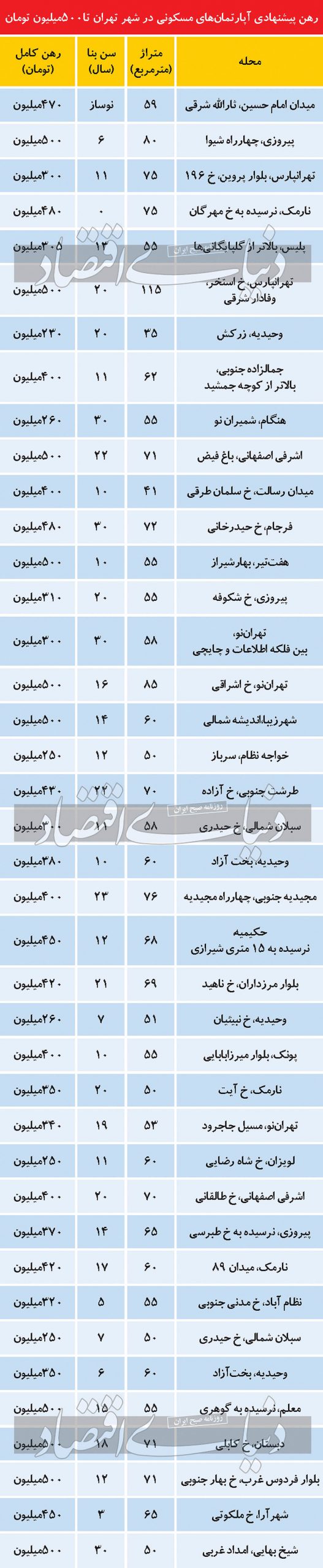 با ۵۰۰ میلیون تومان در محدوده منطقه ۵ محله بلوار فردوس غرب، یک واحد مسکونی با عمربنای کمتر از ۱۰ سال با مساحت بین ۵۰ تا کمتر از ۶۰ مترمربع میتوان اجاره کرد. البته این میزان رهن مختص واحدی است که از امکانات متعارف ذکرشده در فوق برخوردار است. در جدول زیر رهن کامل پیشنهادی برای واحدهای مسکونی تا مبلغ ۵۰۰میلیون تومان در شهر تهران اعلام شده است.
