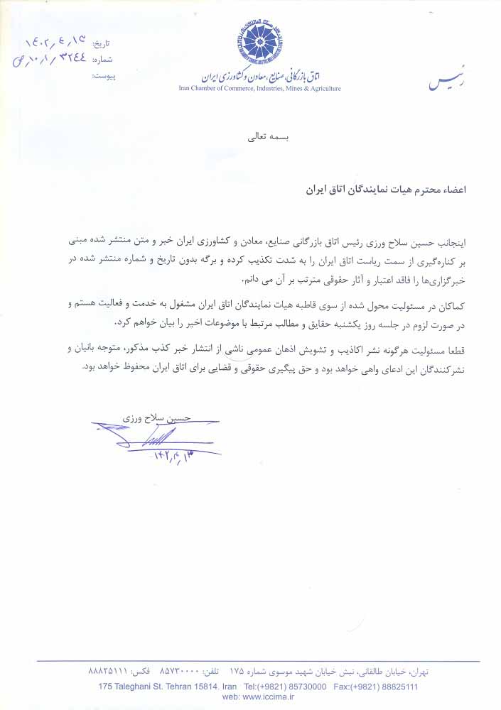 اینجانب حسینسلاح ورزی از ریاست اتاق بازرگانی ایران کنارهگیری نکرده و در مسئولیت محول شده از سوی هیئت نمایندگان مشغول به خدمت هستم. برگ منتشر شده را فاقد اعتبار و آثار حقوقی میدانم.