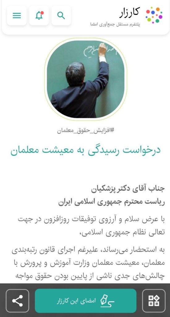 به استحضار میرساند، علیرغم اجرای قانون رتبهبندی معلمان، معیشت معلمان وزارت آموزش و پرورش با چالشهای جدی ناشی از پایین بودن حقوق مواجه است. معلمان برای انجام درست وظیفه خود، یعنی آموزش و پرورش نسل آینده کشور، با مشکلات جدی روبهرو هستند و حتی حقوق معلمان کفاف هزینههای رفت و آمد به مدرسه را هم نمیدهد؛ چه برسد به اینکه معلم بتواند برای آینده خود برنامهریزی داشته باشد. حقوق فعلی معلمان (میانگین دریافتی ۲۰ میلیون تومان) تنها برای ۱۰ روز اول ماه، آن هم با مشقت فراوان، کافی است. اکثر معلمان، همان الگوهای آیندگان سرزمینمان، برای گذران زندگی مجبور به فعالیت در شغلهایی مانند مسافرکشی در تاکسیهای اینترنتی یا سایر مشاغلی هستند که نه در شأن نظام جمهوری اسلامی و نه در شأن این عزیزان است. معلمان جوان توانایی حتی تشکیل خانواده و ازدواج را ندارند و معلمان باسابقه نیز توان اداره و حفظ خانوادهشان را ندارند.