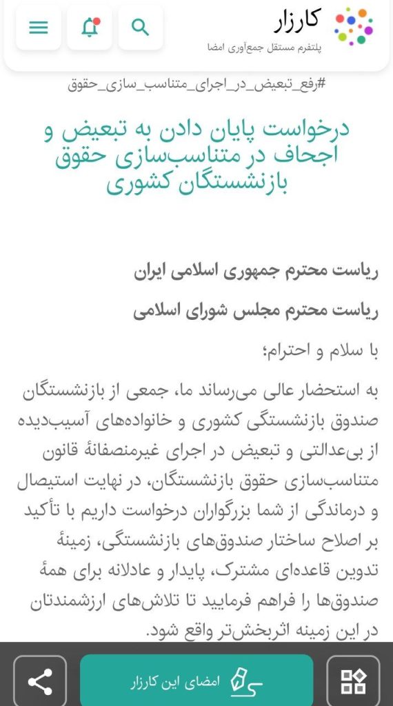 به استحضار عالی می‌رساند ما، جمعی از بازنشستگان صندوق بازنشستگی کشوری و خانواده‌های آسیب‌دیده از بی‌عدالتی و تبعیض در اجرای غیرمنصفانهٔ قانون متناسب‌سازی حقوق بازنشستگان، در نهایت استیصال و درماندگی از شما بزرگواران درخواست داریم با تأکید بر اصلاح ساختار صندوق‌های بازنشستگی، زمینهٔ تدوین قاعده‌ای مشترک، پایدار و عادلانه برای همهٔ صندوق‌ها را فراهم فرمایید تا تلاش‌های ارزشمندتان در این زمینه اثربخش‌تر واقع شود.
