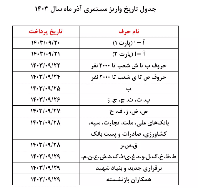بر اساس این گزارش؛ پرداخت حقوق آذرماه بازنشستگان تا ۲۹ ام این ماه و براساس حروف الفبا، طبق جدول ذیل انجام خواهد شد: