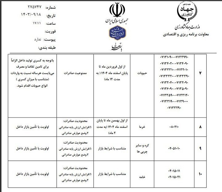 به گزارش کیان آنلاین ، این ممنوعیتها و محدودیتها که برای جلوگیری از کمبود و تنظیم بازار داخلی است، شامل محصولات کره و چربی، حبوبات، خامه و خرما است. مشروح نامه فتحی معاون برنامه ریزی وزارت جهاد کشاورزی به دهنوی رئیس سازمان توسعه تجارت با موضوع اطلاع رسانی سیاستهای تجاری برای محصولات سبزی و صیفی حبوبات و لبنیات سال ۱۴۰۴ به شرح زیر است.