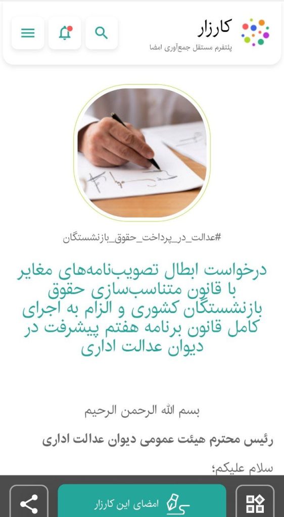 با توجه به پراکندگی جغرافیایی حدود ۶۰۰ هزار نفر بازنشسته نابرخوردار از اجرای کامل قانون، و رعایت مراحل قانونی (از جمله طرح اولیه اعتراض از طریق سامانه سازمان بازرسی کل کشور و دریافت پاسخ صندوق بازنشستگی)، این کارزار به منظور جمعآوری امضاهای الکترونیکی و طرح شکایت جمعی در دیوان عدالت اداری راهاندازی شده است.
