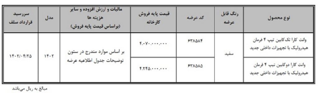 شرایط عرضه وانت کارا تک کابین و دوکابین در بورس کالا در تاریخ 25 اردیبهشت ماه 1402 به شرح جدول ذیل اعلام میگردد.