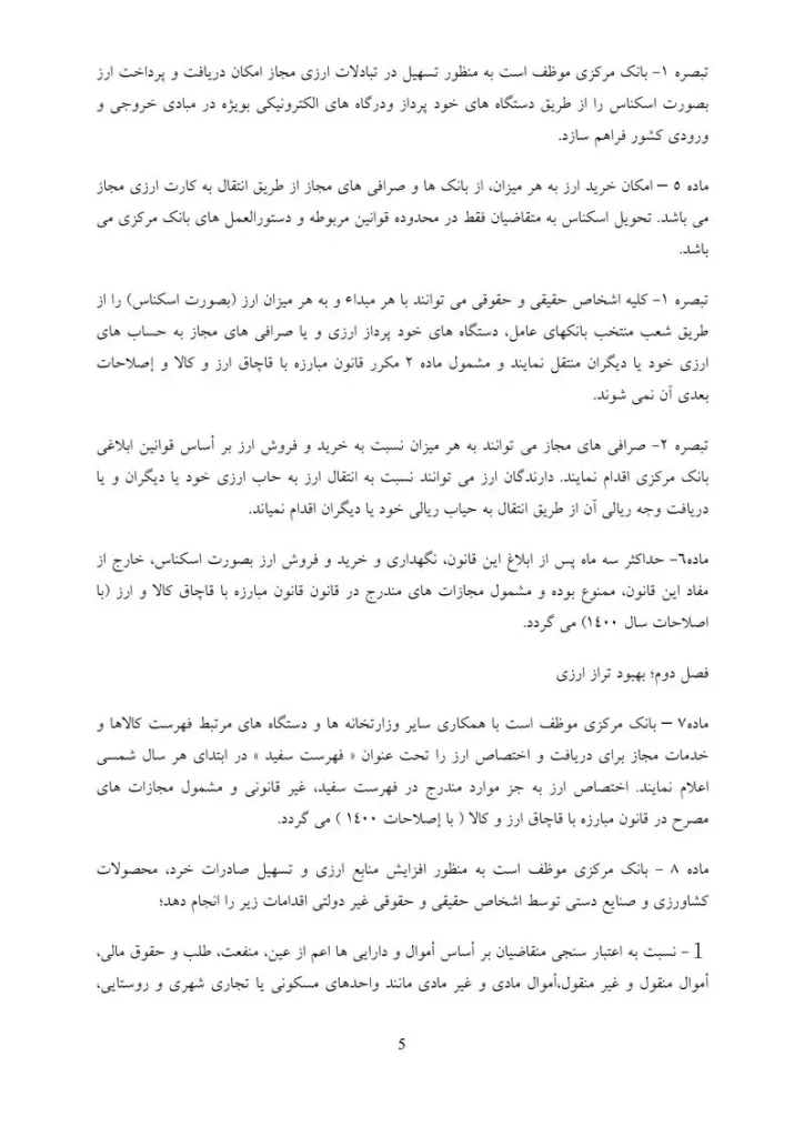 بر اساس ماده ۶ این طرح نیز «حداکثر سه ماه پس از ابلاغ این قانون، نگهداری و خرید و فروش ارز بهصورت اسکناس، خارج از مفاد این قانون، ممنوع بوده و مشمول مجازاتهای مندرج در قانون مبارزه با قاچاق کالا و ارز میشود.»