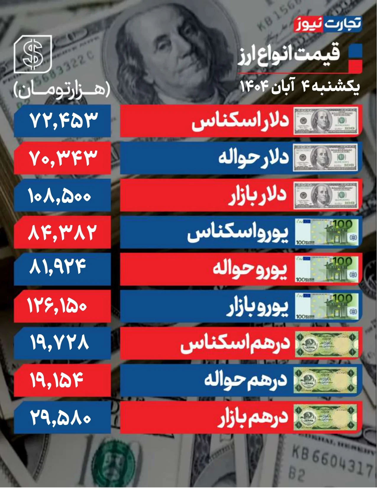 اسکناس دلار در مرکز مبادله روی رقم 72 هزار و 453 تومان قرار گرفت. حواله دلار نیز روی رقم 70 هزار و 343 تومان ایستاد.