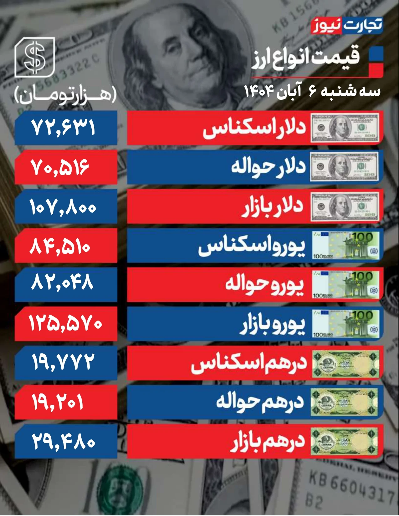 اسکناس دلار در مرکز مبادله روی رقم 72 هزار و 631 تومان ایستاد. حواله دلار روی رقم 70 هزار و 516 تومان معامله شد.