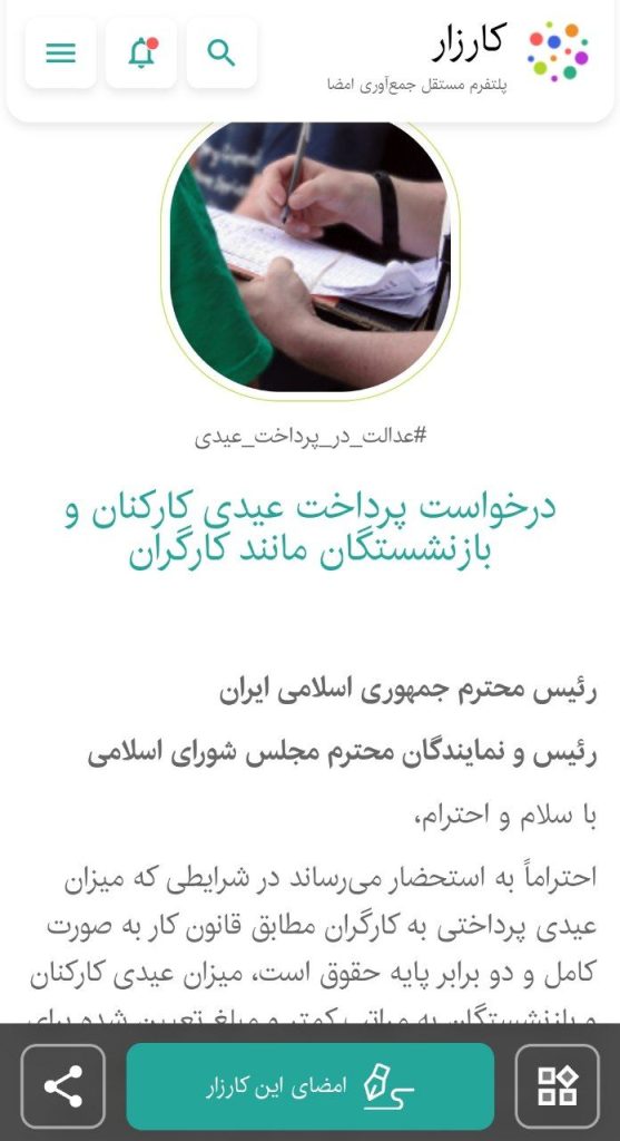 بدین وسیله ما امضاکنندگان این کارزار از جنابعالی و نمایندگان محترم مجلس درخواست داریم در نحوه تعیین عیدی کارکنان و بازنشستگان تجدیدنظر اساسی صورت گیرد تا با رعایت عدالت، این پرداختها همانند کارگران مطابق قانون کار افزایش یابد.