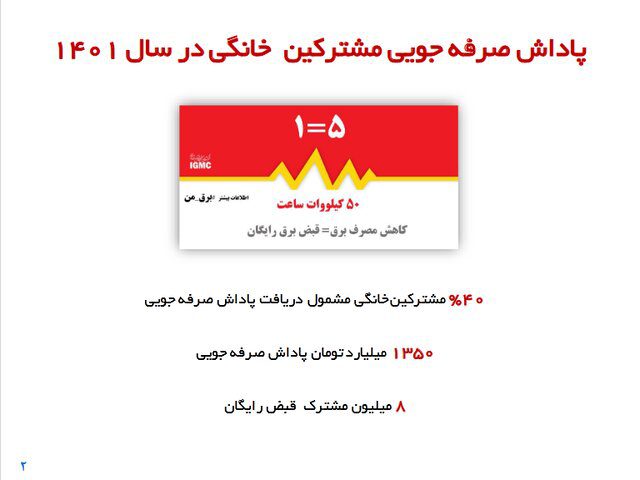 سال گذشته ۴۰ درصد مشترکان خانگی مشمول پاداش خوش مصرفی شدند به‌طوری‌که ۱۳۵۰ میلیارد تومان به این دسته از مشترکان تخصیص یافت و حدود هشت میلیون مشترک مشمول قبض رایگان شدند.