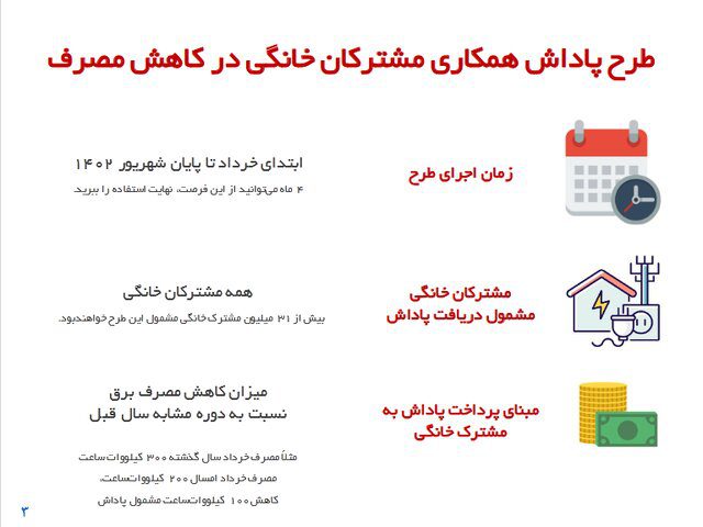 به‌گزارش کیان آنلاین  ، طرح تشویق مشترکان از سال گذشته استارت خود اما تفاوت آن باطرحی که امسال اجرایی می‌شود افزایش ۲۰ برابری مبلغ پاداش و دربرگیری همه مشترکان است، بدین معنا که هر مشترکی که میزان مصرف خود را کاهش دهد مشمول این طرح می‌شود.