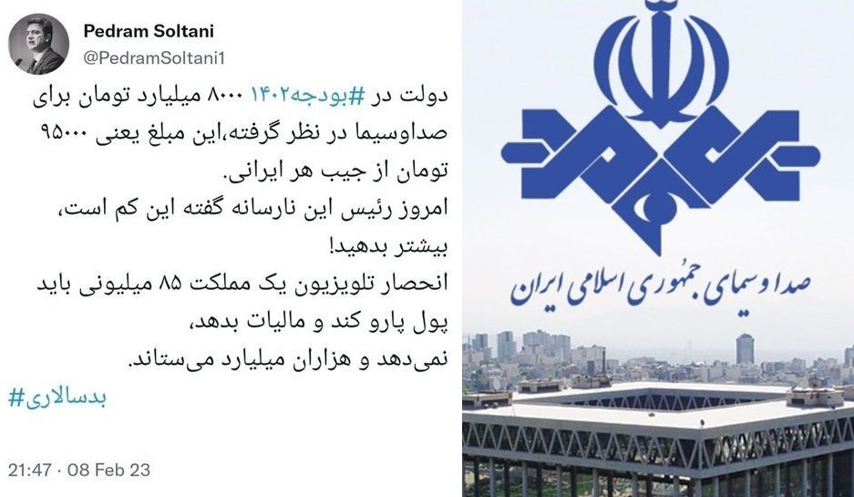 پدرام سلطانی، فعال اقتصادی نوشت: در بودجه سال ۱۴۰۱ صداوسیما، بهطور میانگین سهم هر ایرانی حدود ۹۵.۰۰۰ تومان میشود. رئیس این رسانه گفته کم است! بیشتر دهید. شما چه موافق صداوسیما باشید یا نه، این پول به حساب شما نوشته شده است.