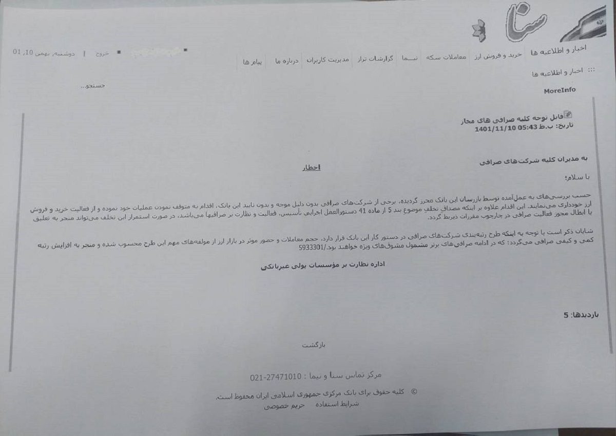 اداره نظارت بر موسسات پولی غیر بانکی بانک مرکزی در نامهای به صرافیها اعلام کرد: حسب بررسیهای به عمل آمده توسط بازرسان این بانک محرز گردیده، برخی از شرکتهای صرافی بدون دلیل موجه و بدون تایید این بانک، اقدام به متوقف نمودن عملیات خود نموده و از فعالیت خرید و فروش ارز خودداری مینمایند.