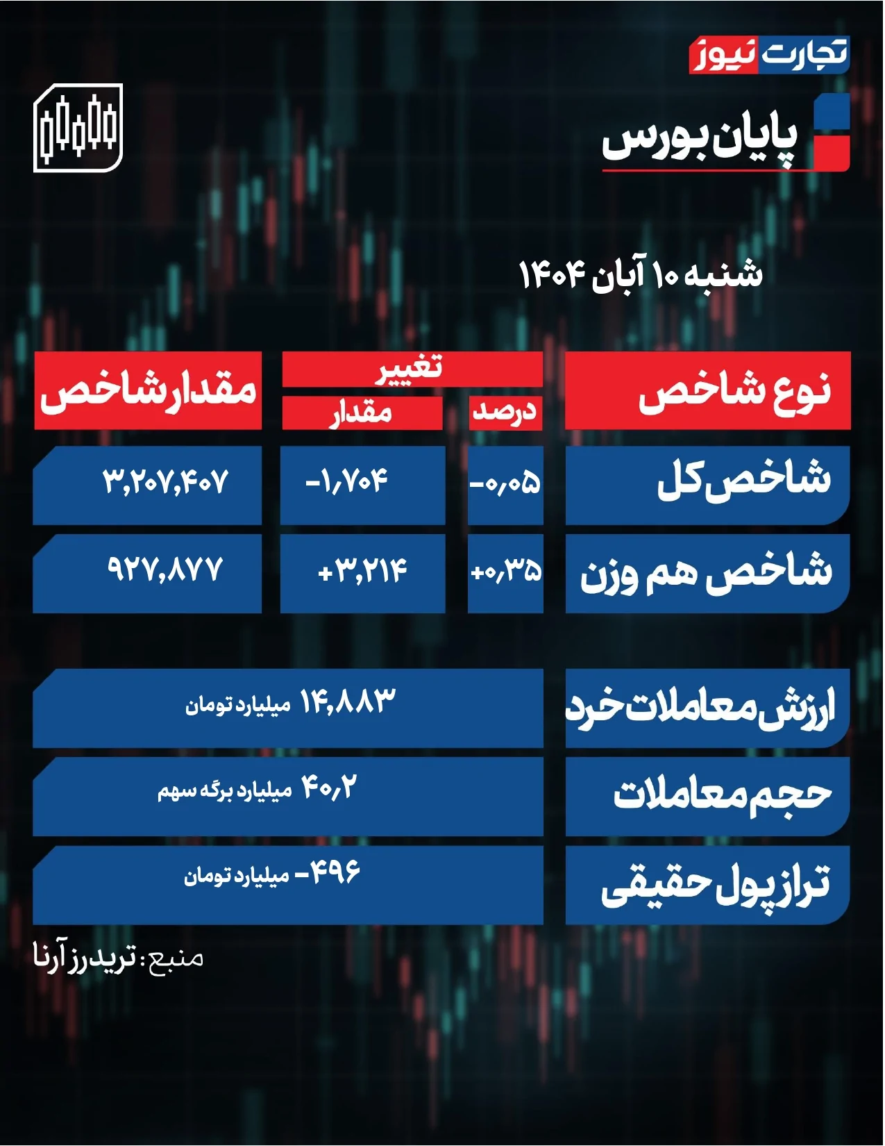 شاخص کل بورس امروز هزار و 704 واحد افت کرد و با کاهش 0.05 درصدی در ارتفاع سه میلیون و 207 هزار و 407 واحد بسته شد. شاخص هموزن اما امروز رشد کرد و با افزایش سه هزار و 214 واحدی 0.35 درصد واحد بالا رفت تا در سطح 927 هزار و 877 واحد قرار گیرد.