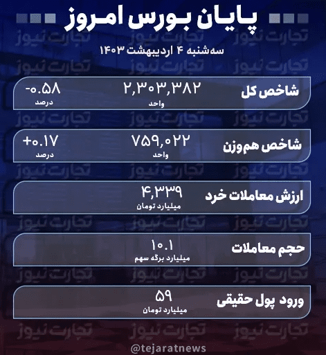 کیان آنلاین – تجارت نیوز در گزارشی نوشت: معاملات بورس امروز به نحوی رقم خورد که شاخص کل در خلاف جهت کندل روز معاملاتی گذشته خود رفتار کرد. به طوری که در پایان بورس امروز، شاخص کل با کاهش ۱۳ هزار و ۴۲۰ واحدی که معادل ۰.۵۸ درصد این شاخص است، روبهرو شد. بر این اساس شاخص کل در پایان معاملات امروز در سطح دو میلیون و ۳۰۳ هزار واحدی ایستاد.