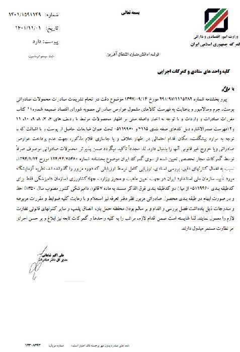 لزوم اعمال کنترل های دقیق و بررسی اسنادی و ارزیابی کامل ، اخذ نظریه آزمایشگاه جهت تعیین ماهیت و مجوز جهادکشاورزی برای صادرات پوست، چرم و سالمبور از جمله دستورات گمرک کشور است که امید می رود باعث شود در آینده سخت گیری‌های بیشتری در زمان صادرات این محصولات ایجاد شود.