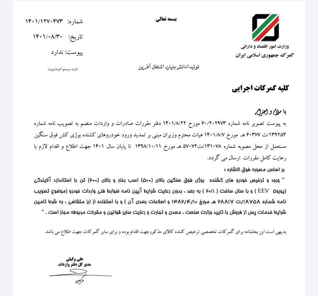 ورود و ترخیص خودروهای کشنده بوژی فوق سنگین بالای ۵۰۰ اسب بخار و بالای ۲۰۰ تن با استاندارد یورو ۵ با تأئید وزارت صمت تا پایان سال 1401 مجاز است