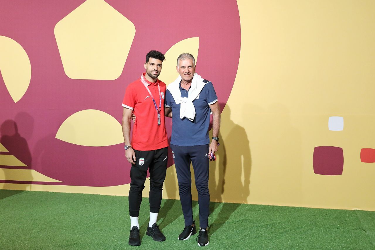 کارلوس کی روش و مهدی طارمی در حاشیه نشست خبری با لبخند جلوی دوربین عکاسان قرار گرفتند.