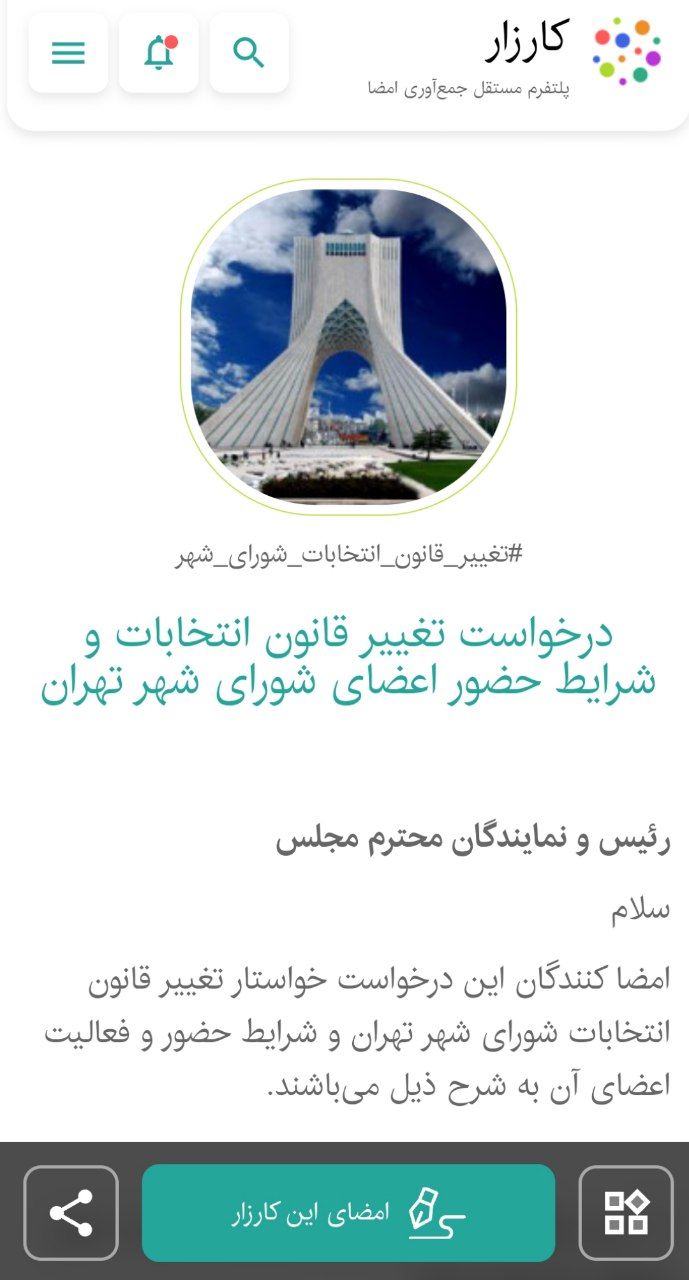 امضا کنندگان این درخواست خواستار تغییر قانون انتخابات شورای شهر تهران و شرایط حضور و فعالیت اعضای آن به شرح ذیل میباشند.